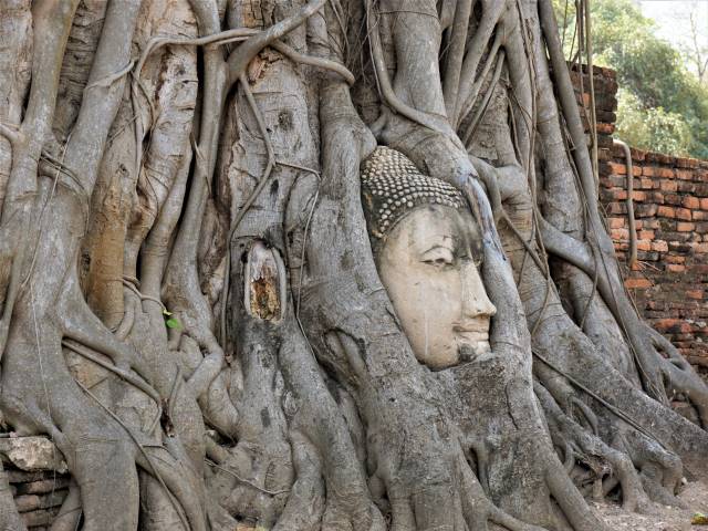 Photo: Buddha head embedded in a banyan tree, temple of Wat Mahathat in Ayutthaya @Sue Slaght
