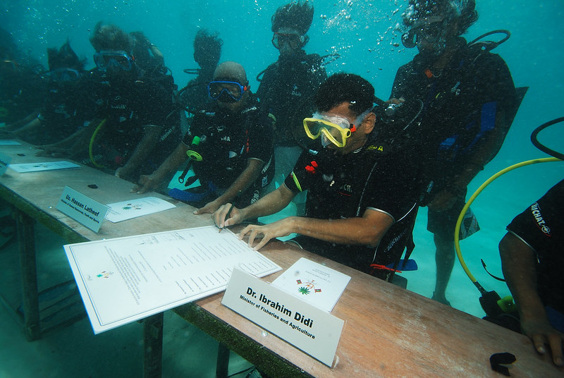 Photo: Underwater signing, Maldives. Credit: Mohamed Seeneen / Climate Visuals